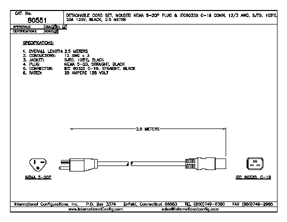 Detachable power cord set, NEMA 5-20P straight plug per standard UL 498 and IEC 60320 (320) C-19 straight connector. SJT0 105C 3x12 AWG cordage. 2.5 meters long. Rated 20 ampere 125 volts. 2 pole 3 wire grounding.